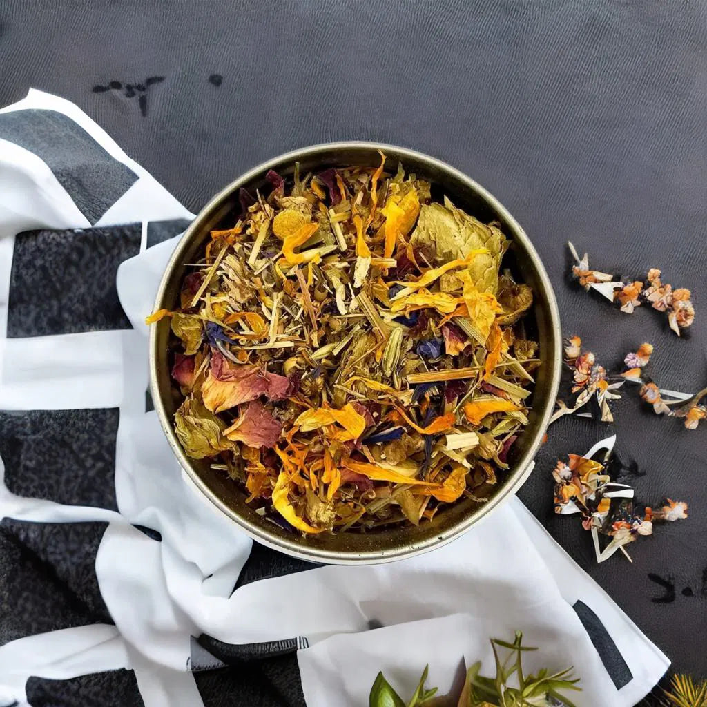 Ingredients: chamomile, spearmint, lemon balm, lemongrass, oat straw, fennel seed, passionflower, St. John wort, calendula, cornflower, rose petals, hops flower and valerian root